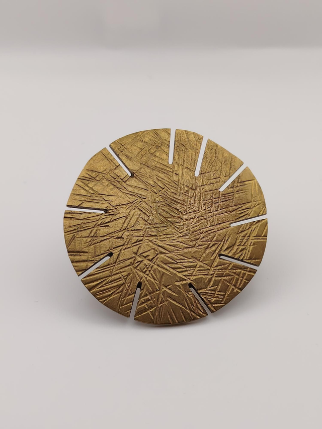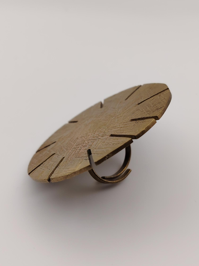 Bague imposante en laiton doré arbore un motif circulaire texturé, inspiré des rayons du soleil. Un bijou audacieux et symbolique, qui habille la main avec force et élégance.