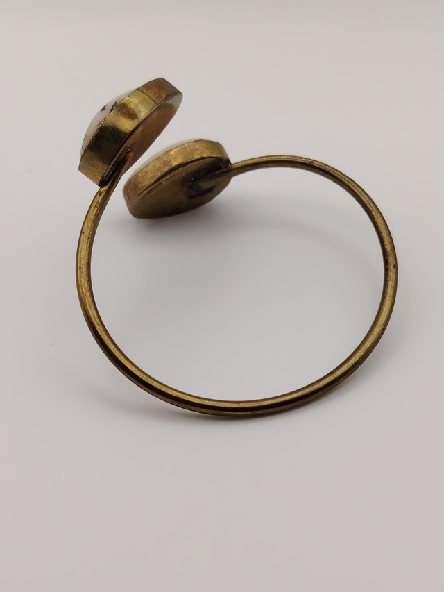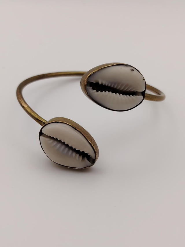 Ce bracelet ouvert allie authenticité et élégance. Orné de deux véritables coquillages "cauris" soigneusement montés sur une structure en laiton. Il incarne a la fois la force, la féminité et la spiritualité.
