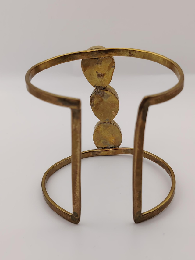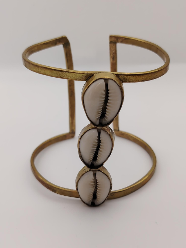Cette manchette met à l'honneur l'alliance du laiton doré et des cauris, symbole de féminité et de prospérité dans de nombreuses cultures africaines.